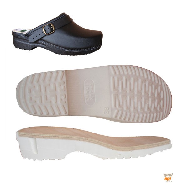 Semelle interieure bois avec voûte plantaire, enrobée polyuréthane, antidérapante et silencieuse.